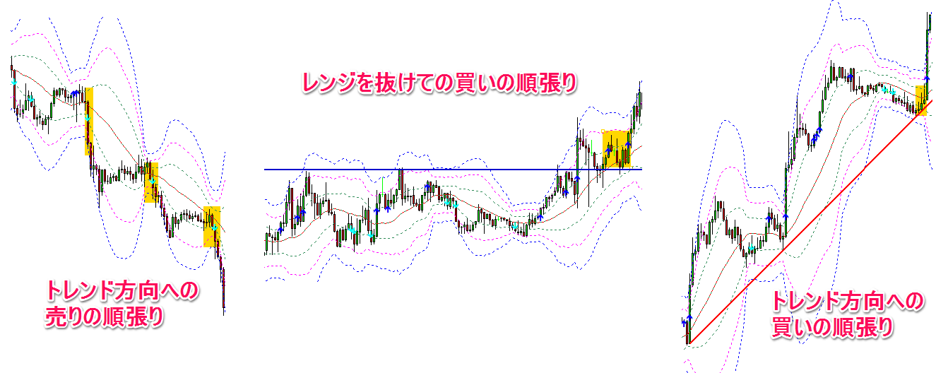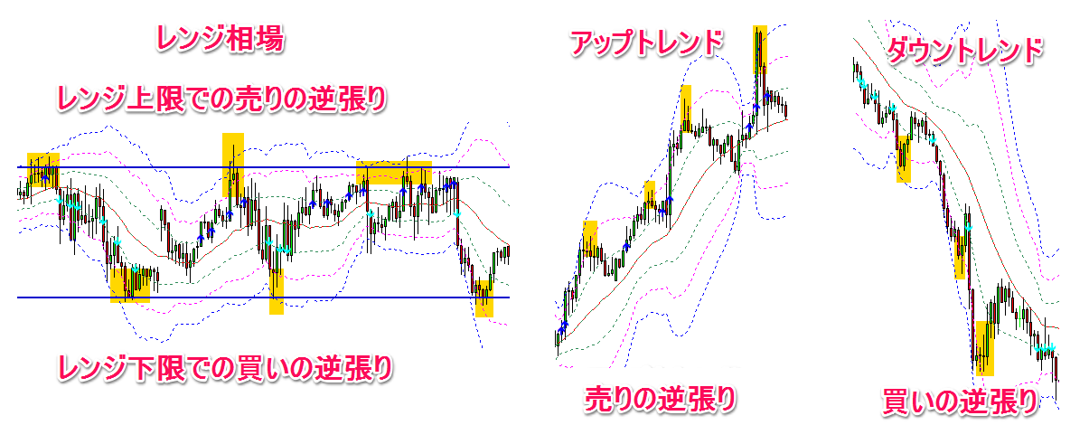 主ににレンジ相場やトレンドのリトレースが入るところを狙う局面になりますが、トレンドのリトレースを狙ってポジションを持つのは難易度が高いのでおすすめしません。