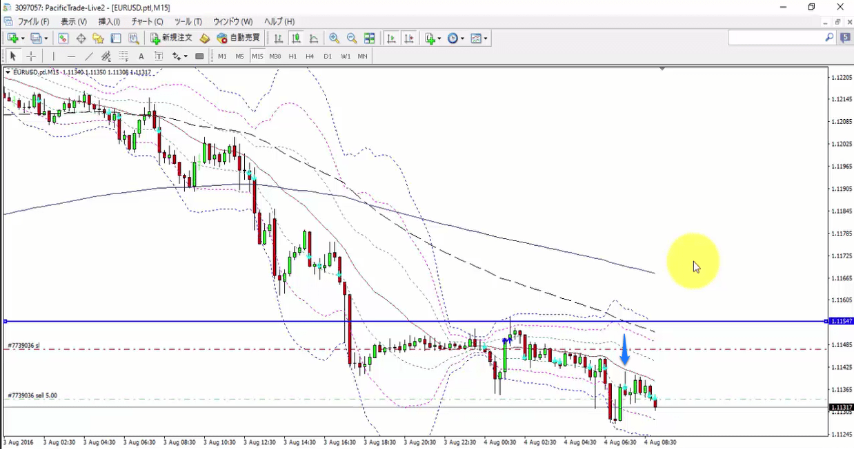 エントリーできるかどうかのタイミングを計るために監視するチャートは、私の場合MAが効いている時間足だと先程説明しましたが、今回は15分足がMAが意識されていましたので15分を執行足にしています。