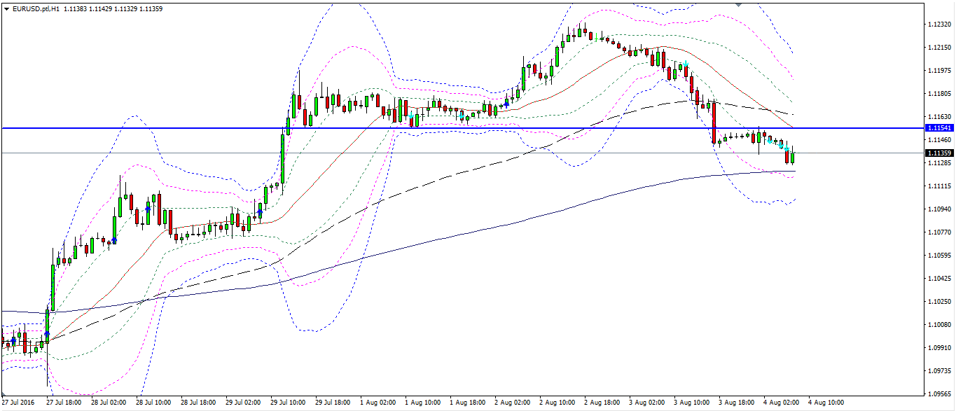 4時間足を見ると直近がアップトレンドで推移してきていましたが、高値をつけた押し目である安値(チャート内の水平線のレート)を下に割って来ている状況であるということがわかると思います。つまり、4時間足ベースではアップトレンドが終了しているという状況であって現段階では優勢だった買い圧力が崩れているわけです。