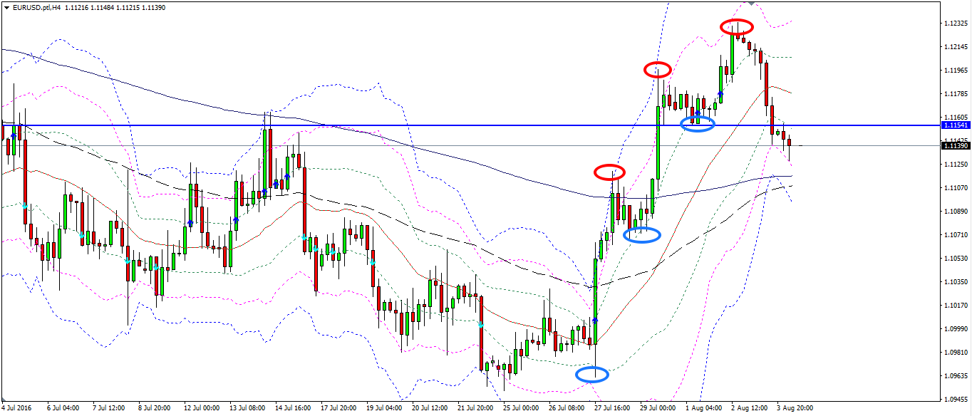 直近は4時間足のEMA200が2回ほどレジスタンス(チャート内の青丸)になって止められているので、再度EMA200までレートが来た場合(チャート内の赤丸)、サポートされる可能性があることを予測できますね。