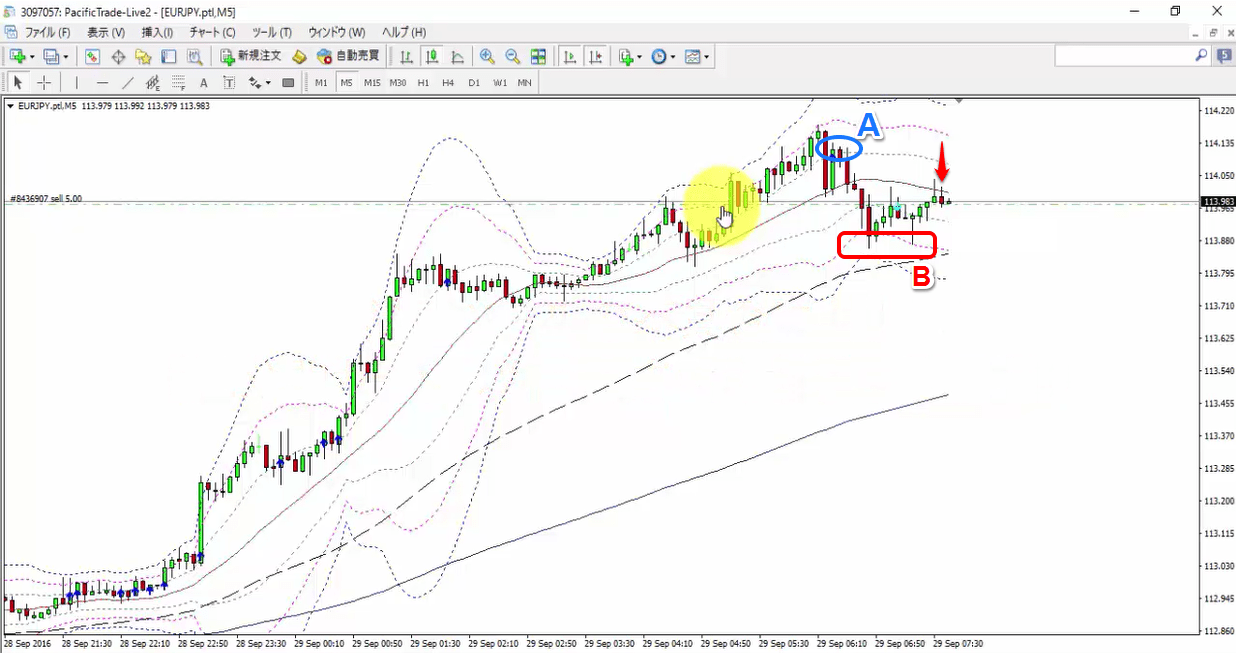 まずは最初に下のチャート(利確直後のチャート)を見て頂きたいのですが、利確するまでに何度かリトレースが入っている(AとB)のを確認できると思います。