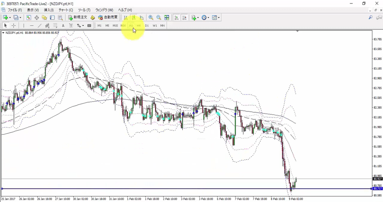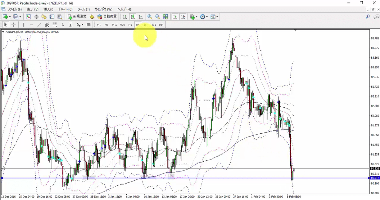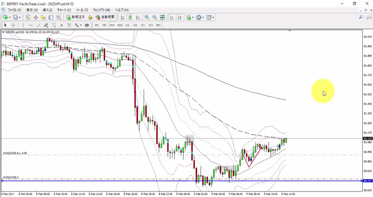 今回のトレード事例は2017.2.9のNZDJPY(長期足のサポート付近で短期足のトレンド転換を狙ったトレード)になります。