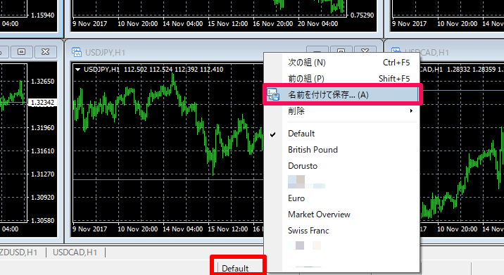 保存の仕方は、MT4の下の方にある”現在のグループ名”をクリックし、”名前を付けて保存”を選択します。