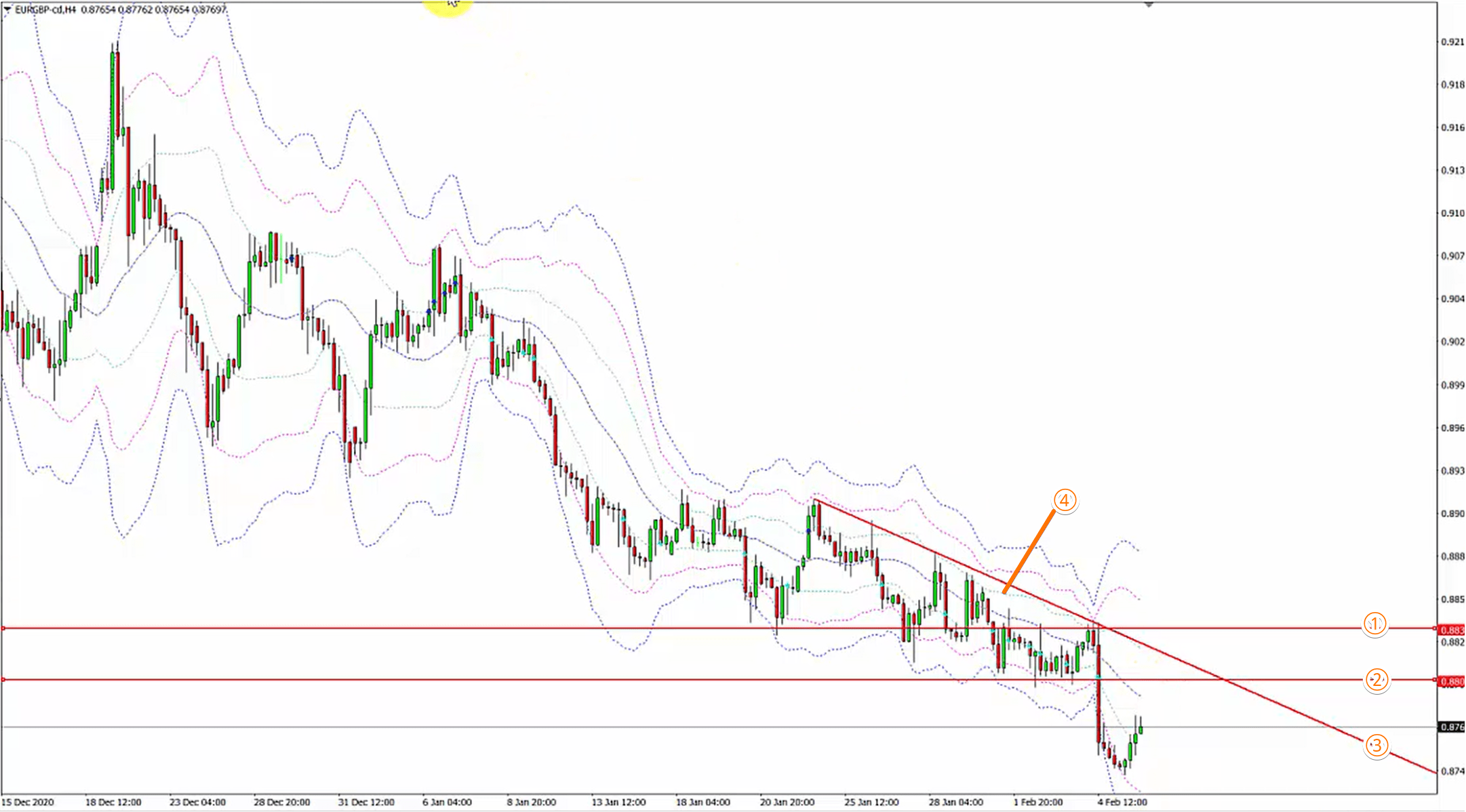 ①の価格帯→カップアンドハンドルになる(この価格を上に抜けると、H4のダウントレンドが終了するため、買いが優勢になる)